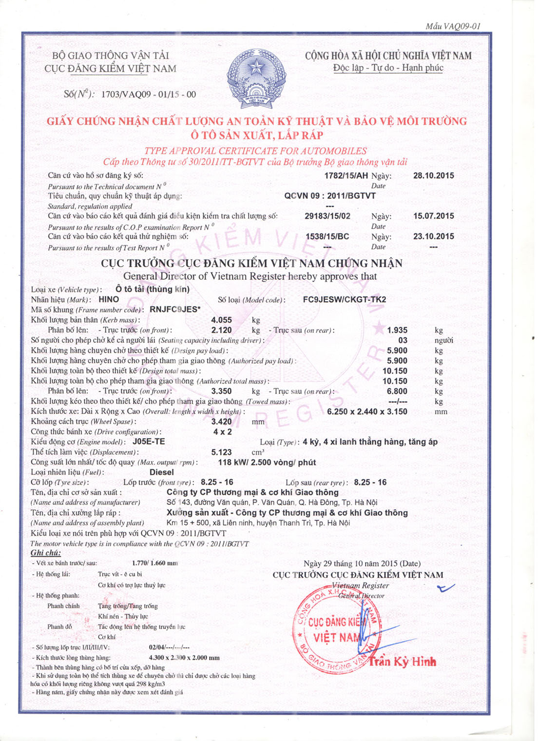 1 Thông tin chung 1.1 Loại phương tiện Ô tô tải (thùng kín) 1.2 Nhãn hiệu, số loại của phương tiện HINO FC9JESW /CKGT-TK2 1.3 Công thức bánh xe 4x2 2 Thông số về kích thước 2.1 Kích thước bao: Dài x Rộng x Cao (mm) 6260x2440x3170 2.2 Chiều dài cơ sở (mm) 3420 2.3 Kích thước lòng thùng hàng: DxRxC (mm) 4300x2300x2000 3 Thông số về khối lượng 3.1 Khối lượng bản thân (kg) 4105 3.2 Khối lượng...