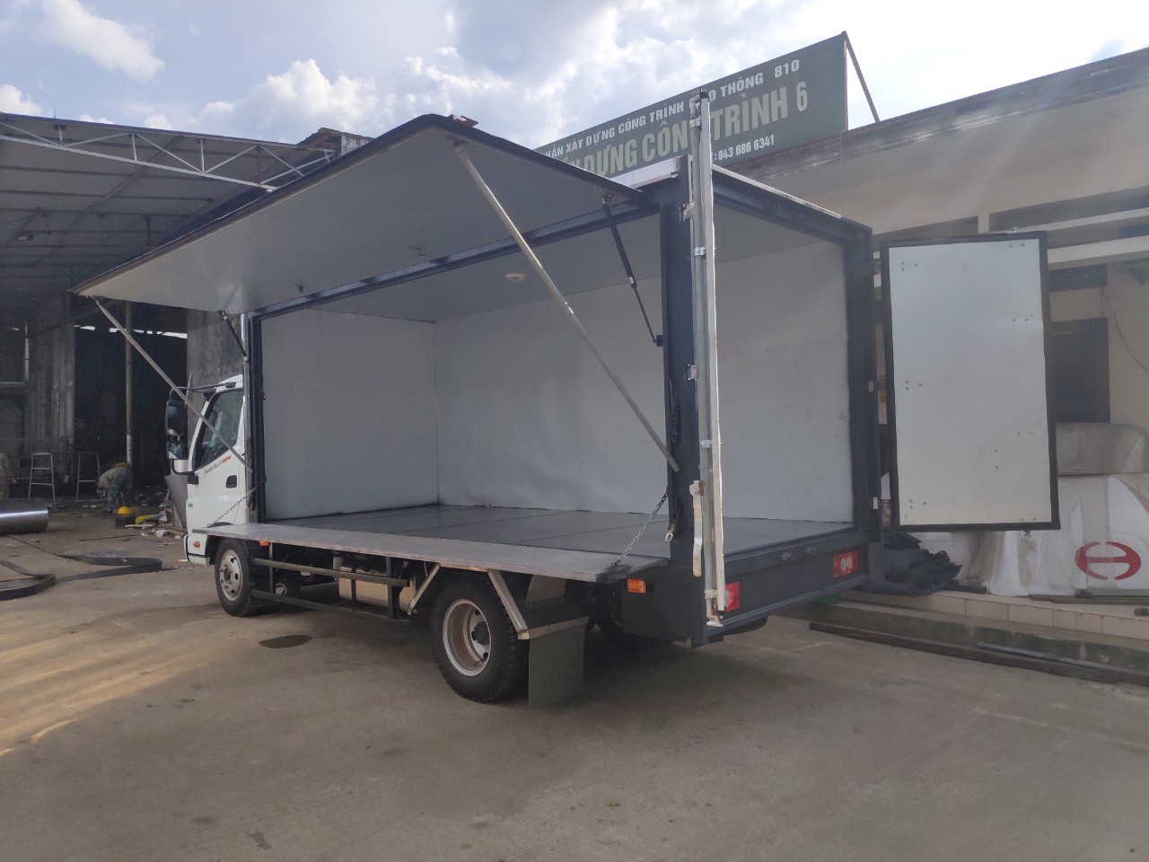 Ô tô tải THACO OLLIN350 thùng kín mở cánh dơi bằng xy lanh hơi, mở hết một bên thùng, vô cùng thuận lợi để đưa hàng hóa vào từ bên hông xe, đặc biệt là những hàng hóa có kích thước lớn,...