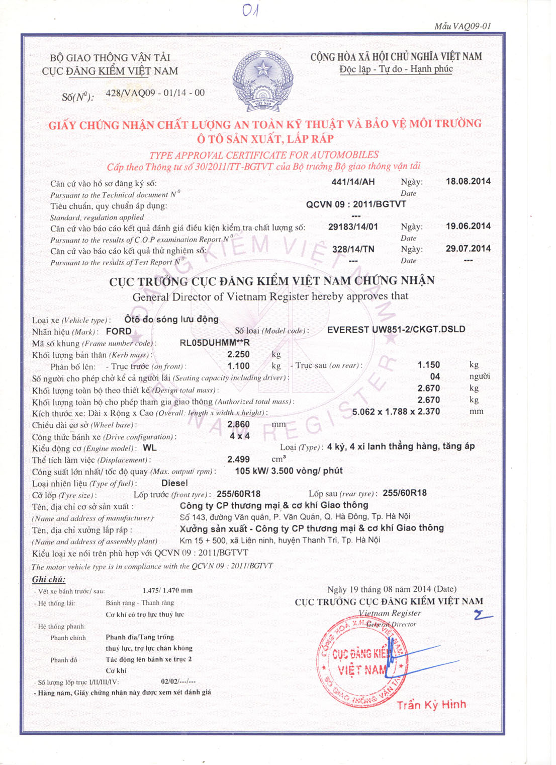 TT Nội dung Thông số 1 Thông tin chung 1.1 Lọai phương tiện Ô tô đo sóng lưu động 1.2 Nhãn hiệu, số loại của phương tiện FORD EVEREST UW851-2/CKGT.DSLD 1.3 Công thức bánh xe 4X4 2 Thông số về kích thước 2.1 Kích thước bao : Dài x Rộng x Cao (mm) 5062 x 1788 x 1826 2.2 Chiều dài cơ sở (mm) 2860 2.3 Kích thước lòng thùng : Dài x Rộng...