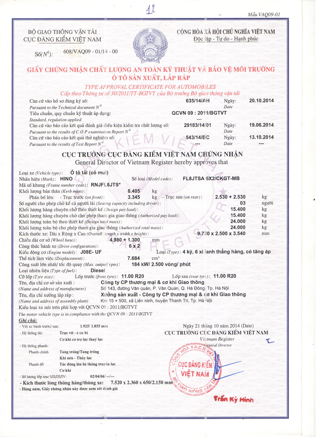 Nhãn hiệu, số loại của phương tiện |